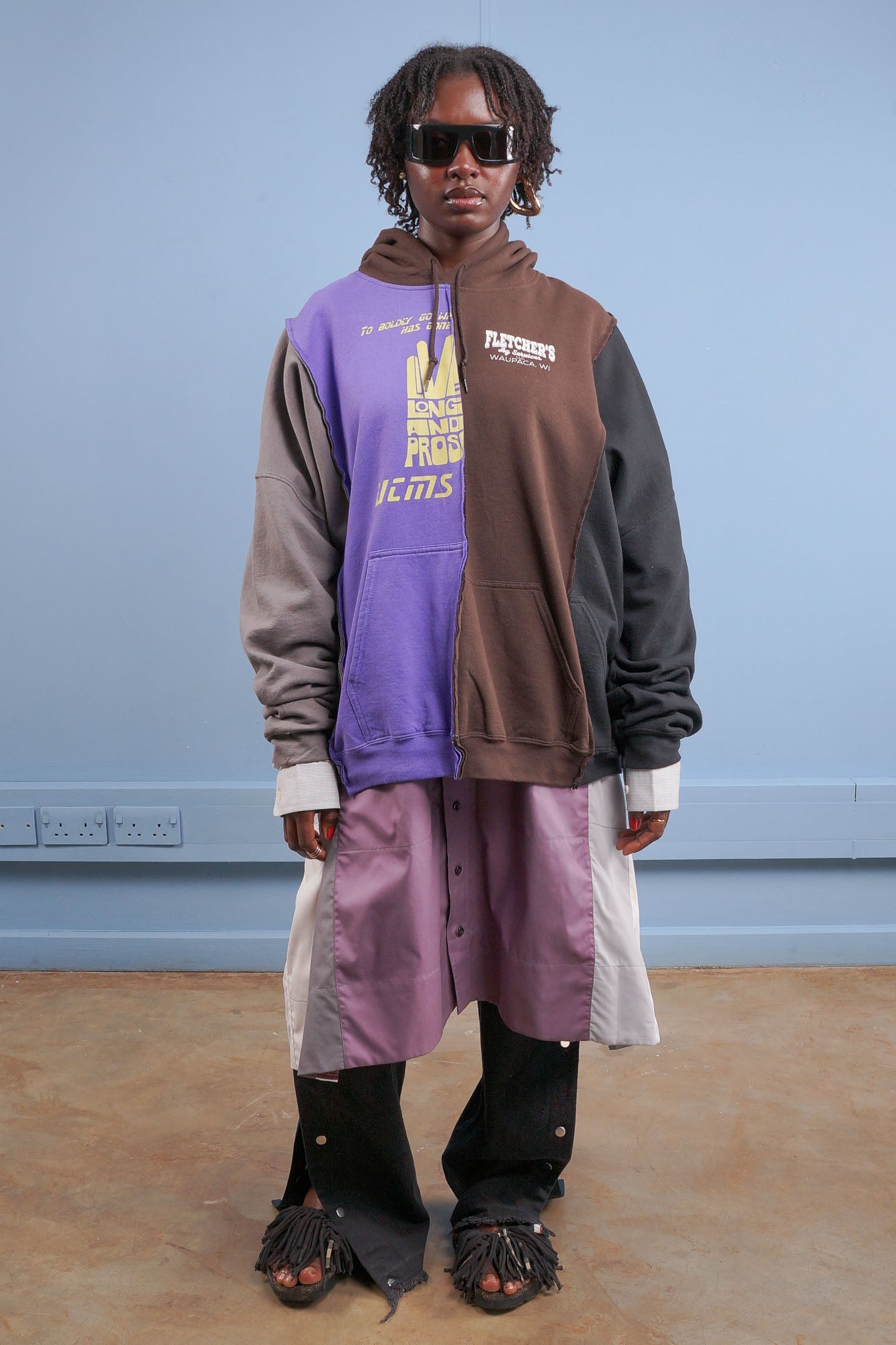 4 枚のスウェットシャツのパネルを組み合わせて、裏返しの縫い目を備えたオーバーサイズのパーカーを作りました。