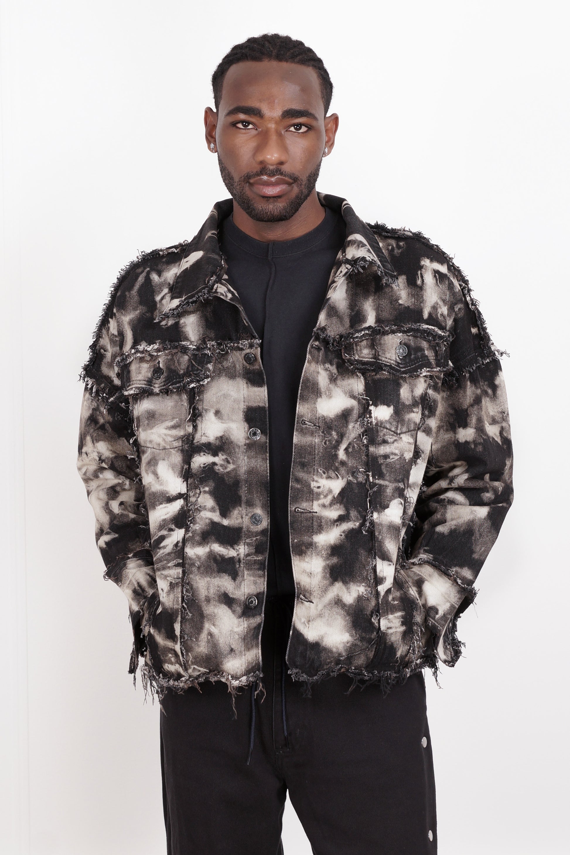 Classic denim jackets dismantled, bleached in pieces and reassembled with all raw seams reversed to the exterior. This piece is full of surprises. The shapes and colours depend on how each jacket reacts to the bleach. We recommend wearing it in a size larger than you usually would.