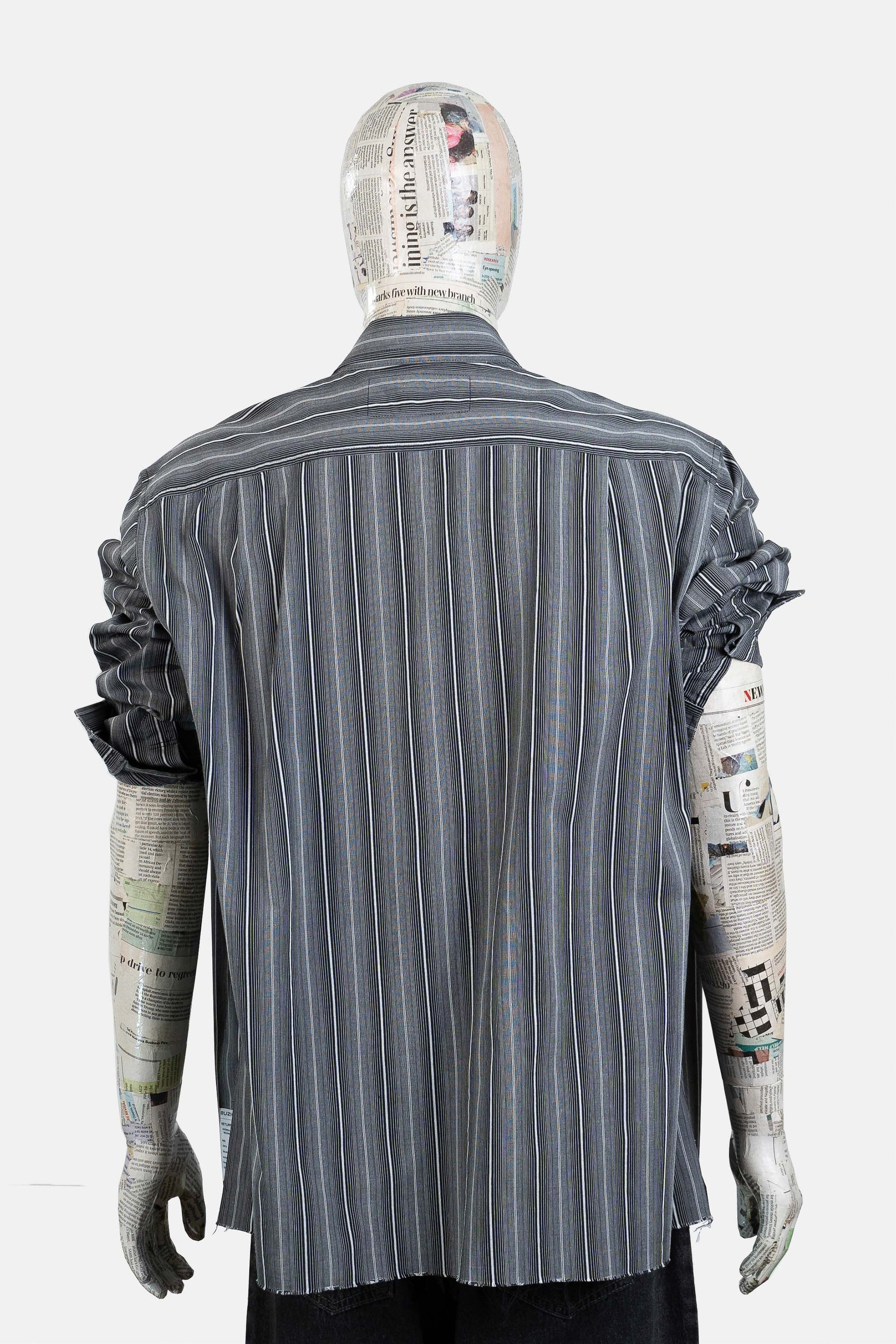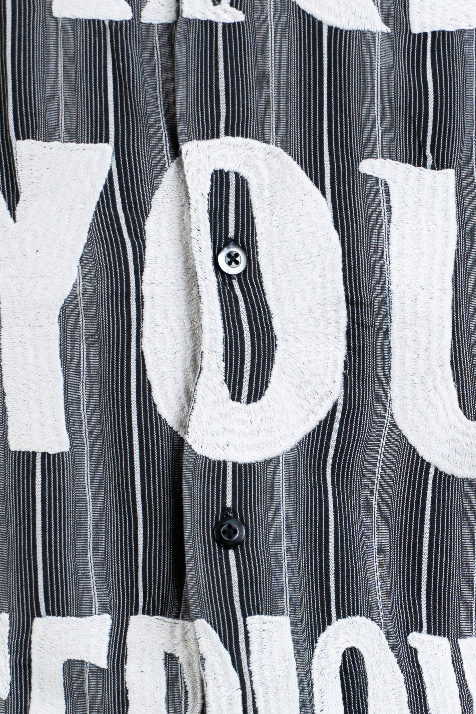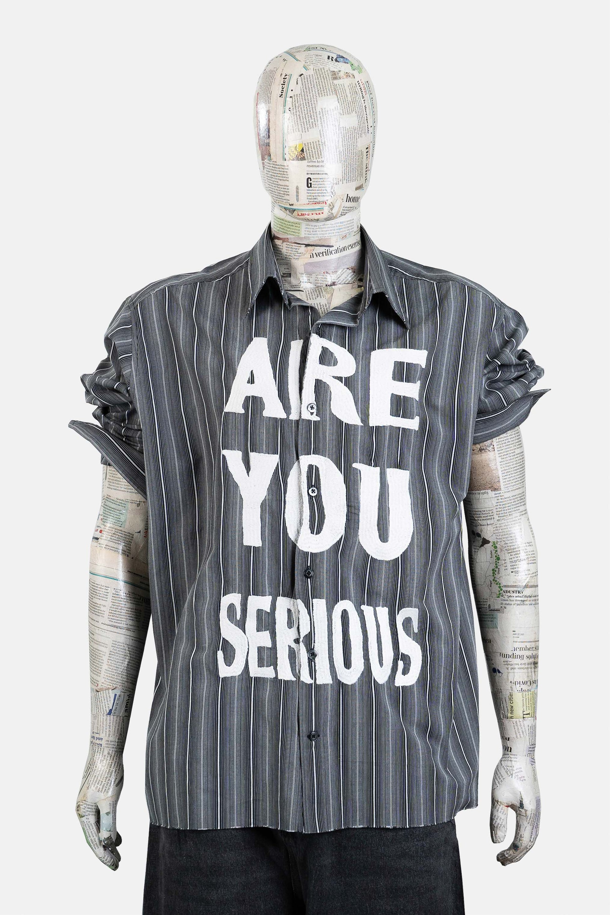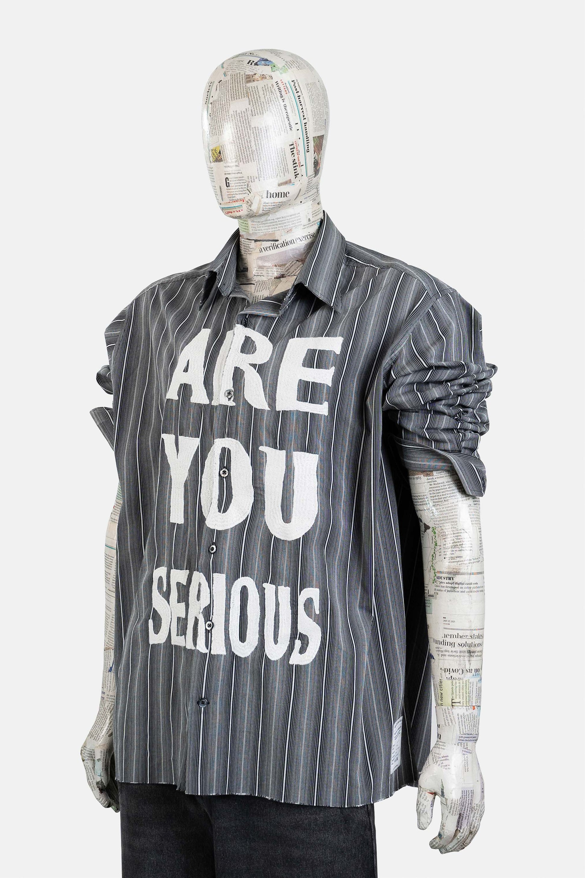 ARE YOU SERIOUS taxi slogan applied onto a shirt by the Milaya Project using traditional South Sudanese embroidery. The raw-cut hem will fray and evolve with time.