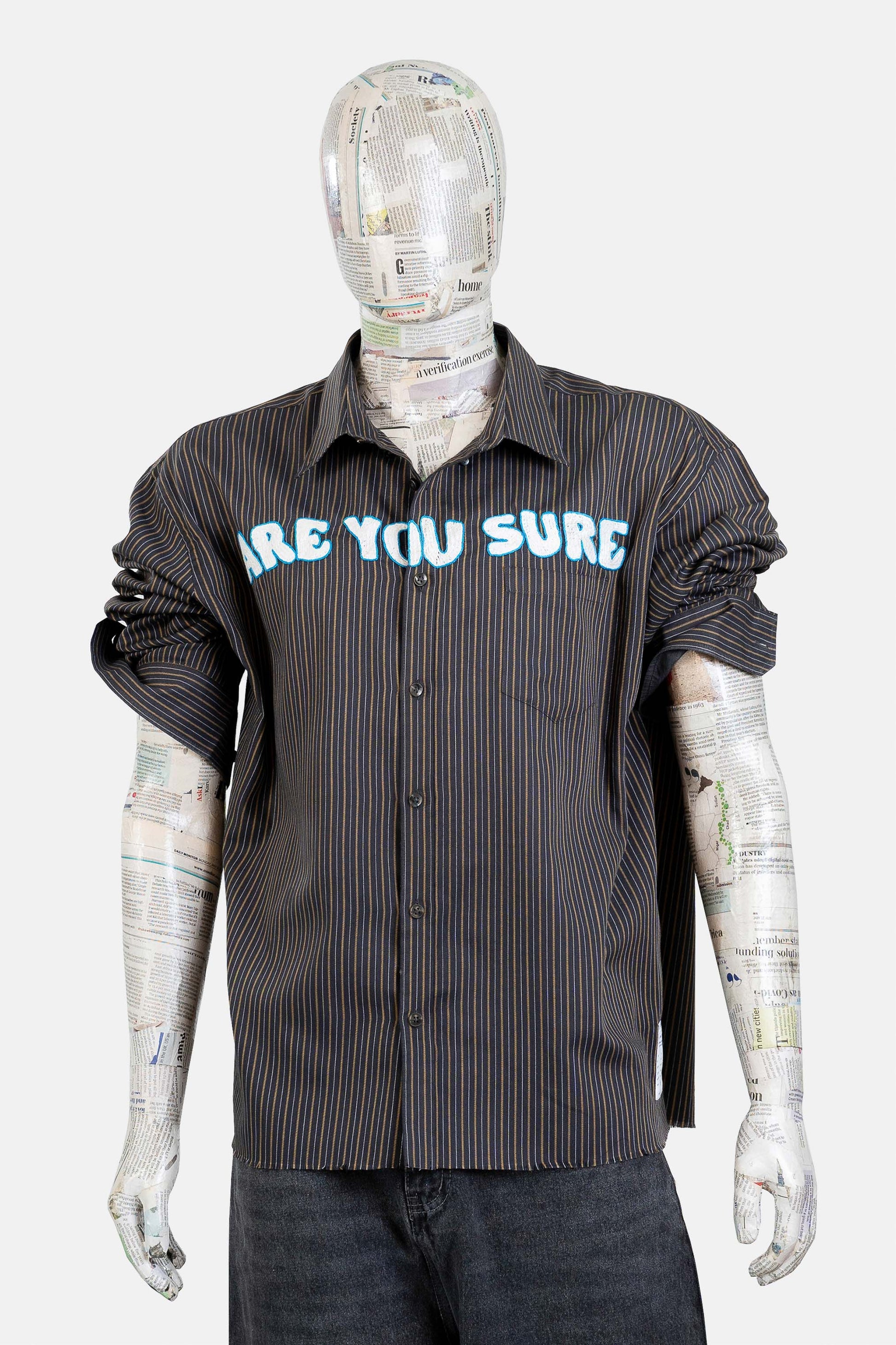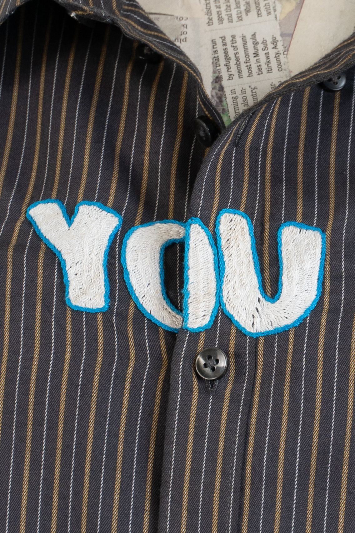 ARE YOU SURE taxi slogan applied onto a shirt by the Milaya Project using traditional South Sudanese embroidery. The raw-cut hem will fray and evolve with time.