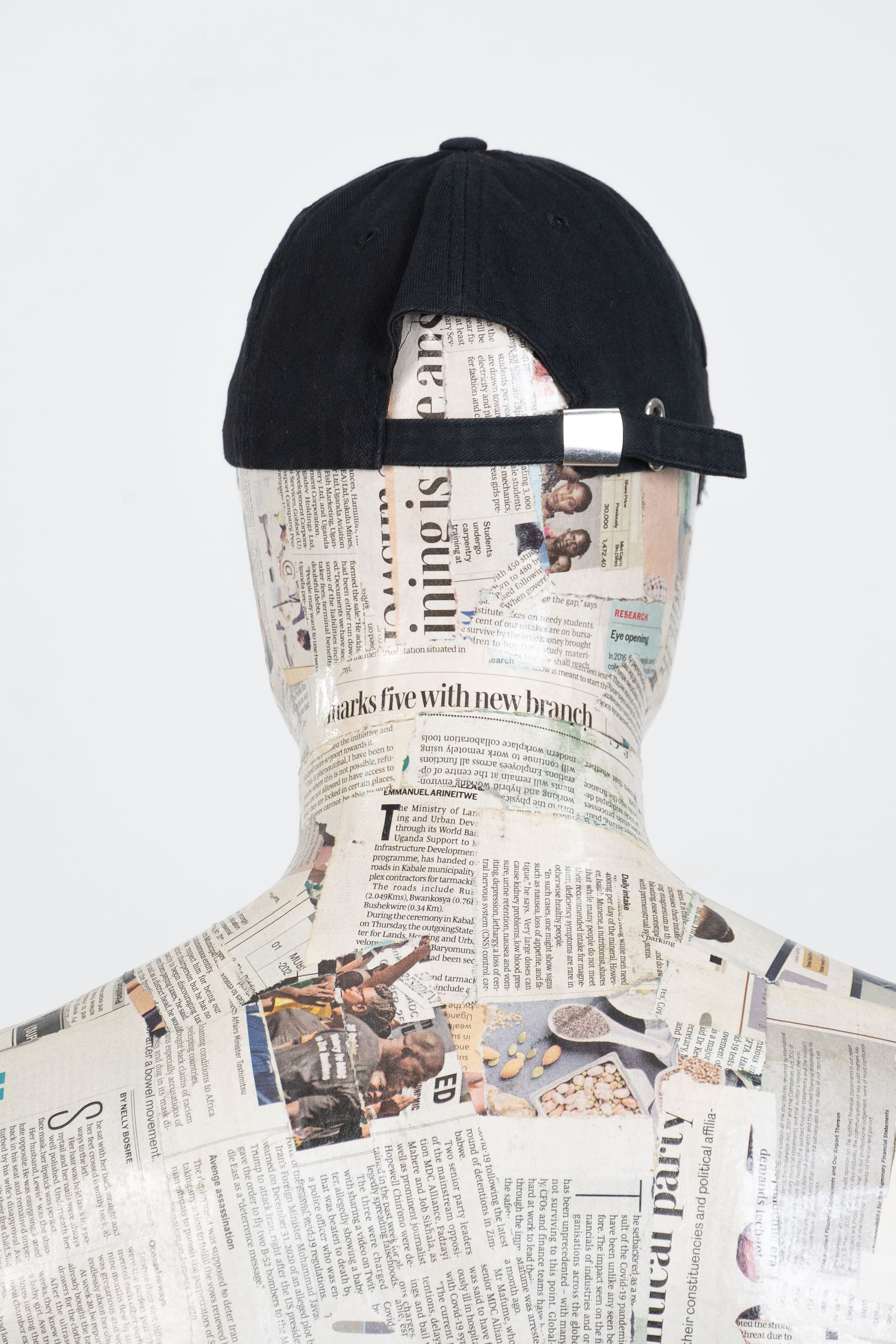 The original logo of a baseball cap is cut out, leaving a raw-edged opening that will fray and evolve with time. The identity of the cap is eliminated, creating space for a new one to emerge. Decorated with metallic eyelets and a triangle patch.