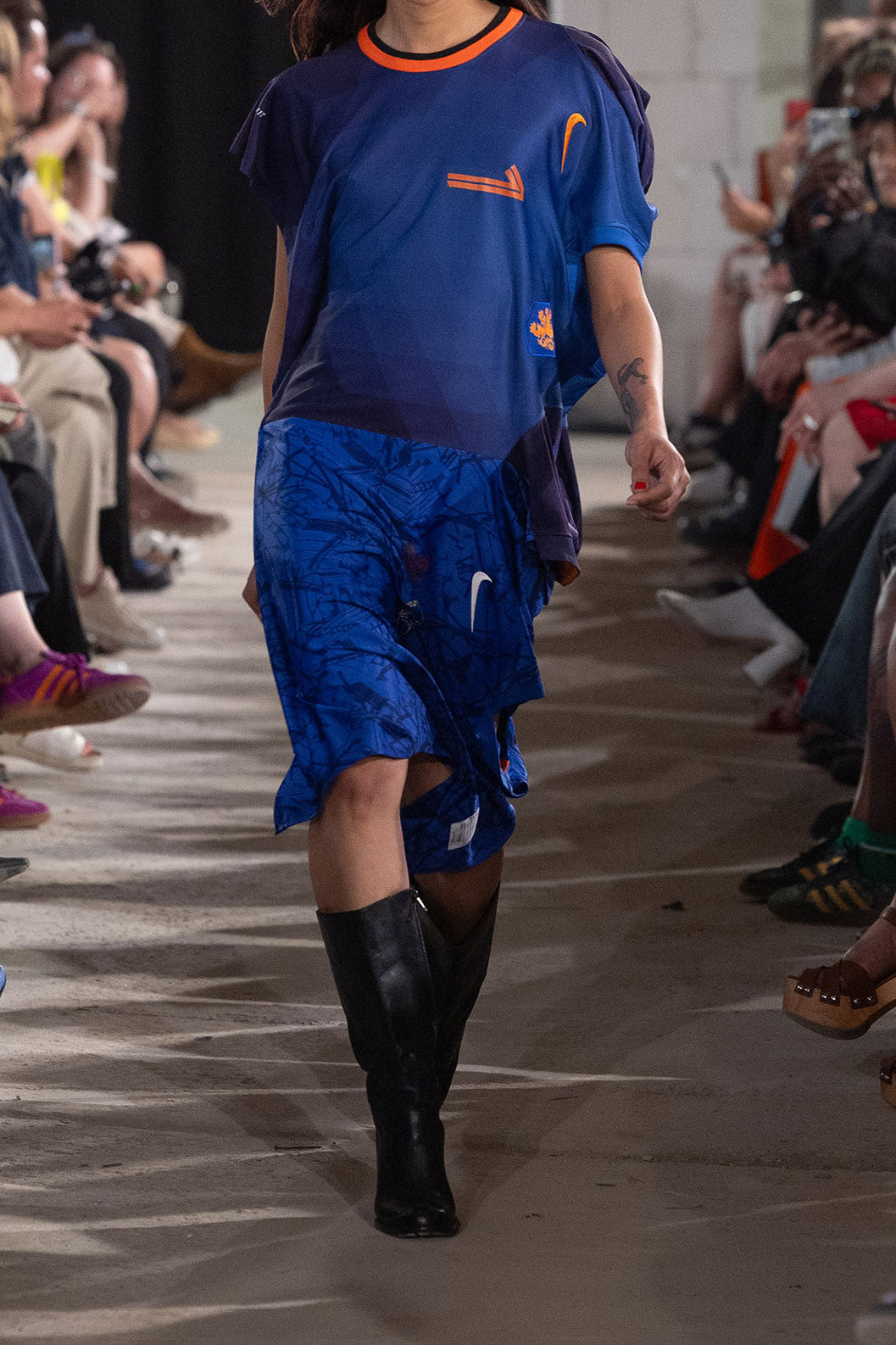 Two original football (or soccer, depending where you're from) jerseys joined at the side seam and flipped by 90° New neck hole created in the side seam, with double rib detail. This dress is particularly fun to style because there are four armholes and two neck holes to play with.