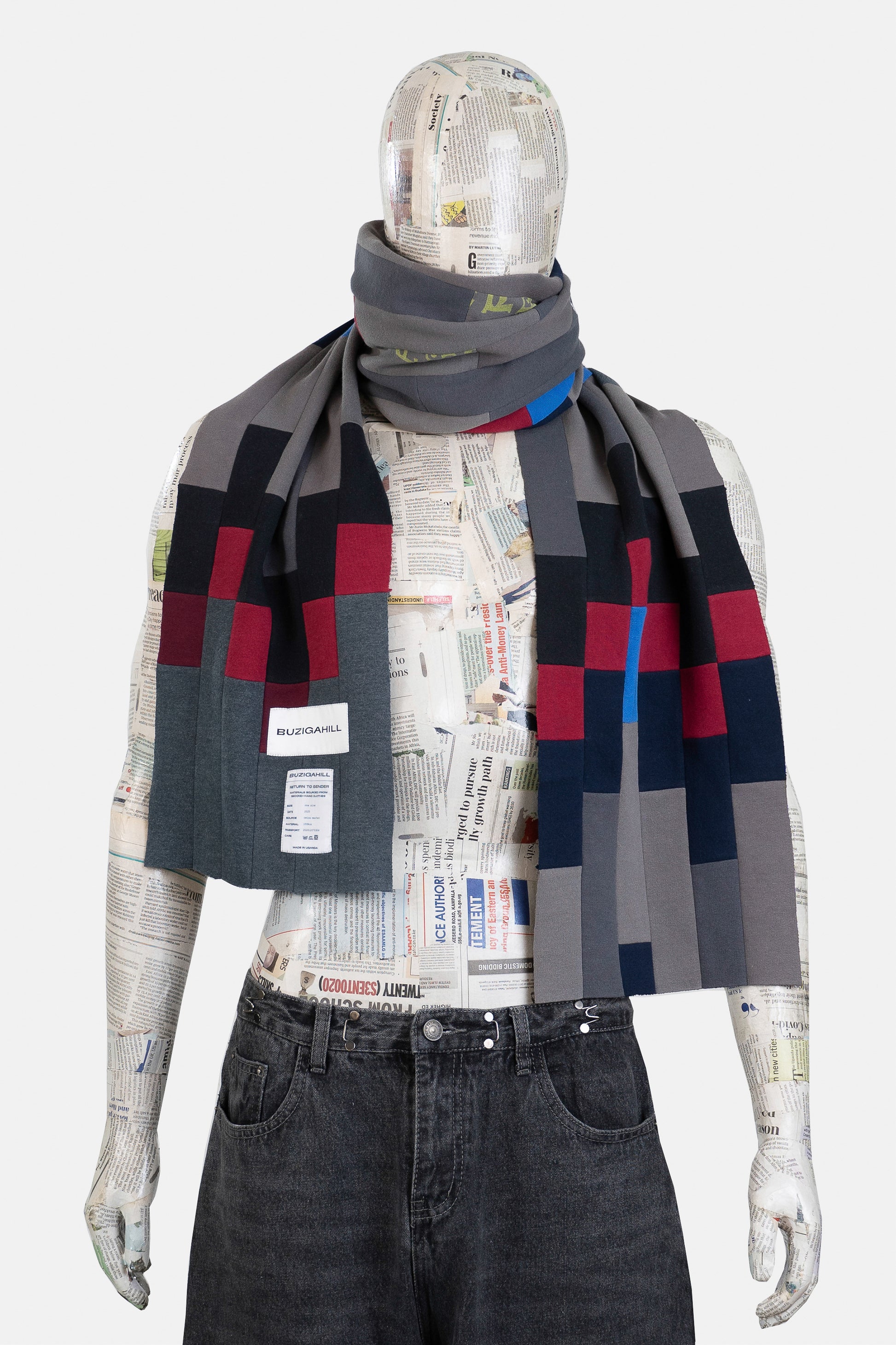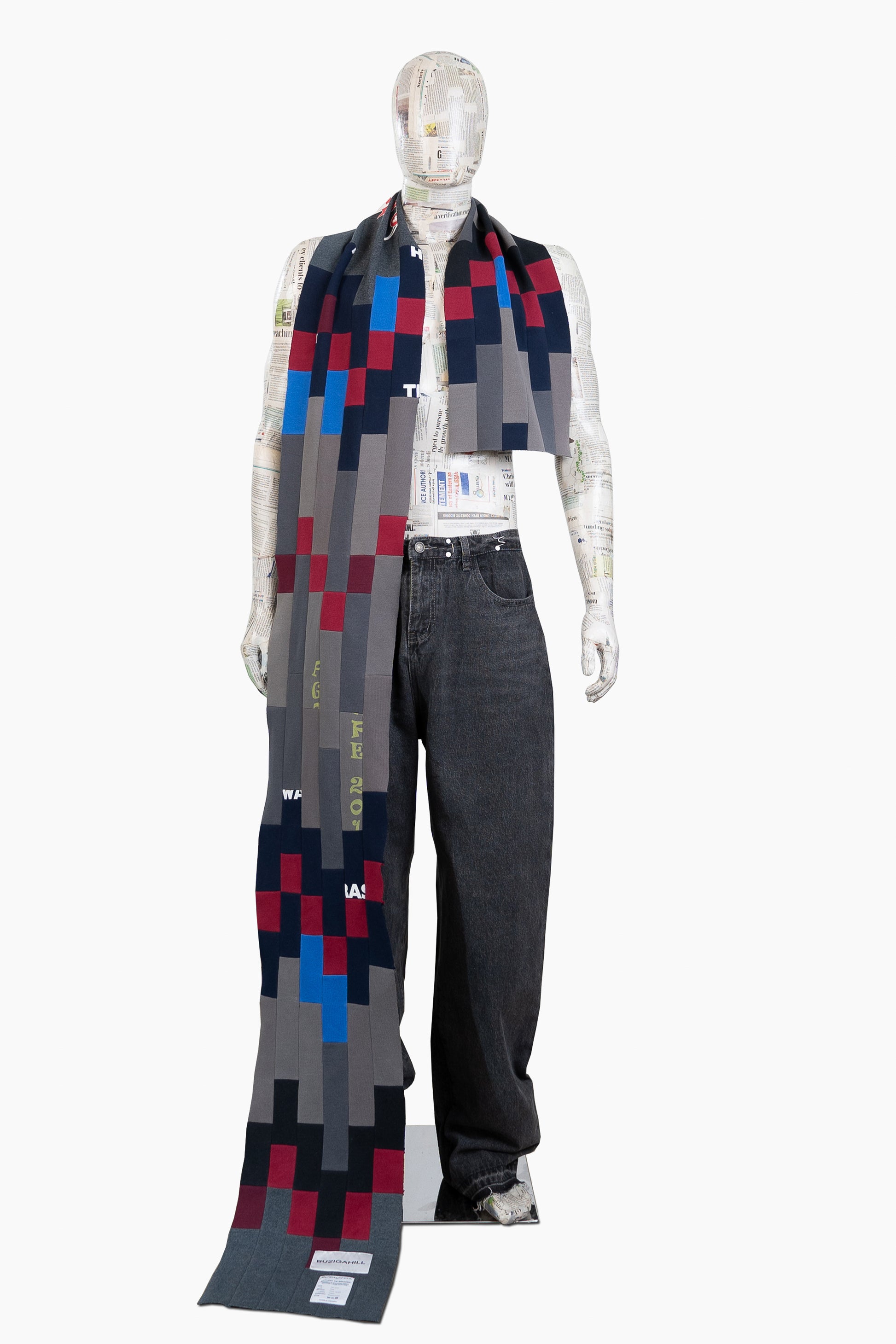 Strips of different lengths are cut from hoodies and carefully rejoined in a pixel-like puzzle remix to make a scarf that is as durable and comforting as your favourite hoodie.