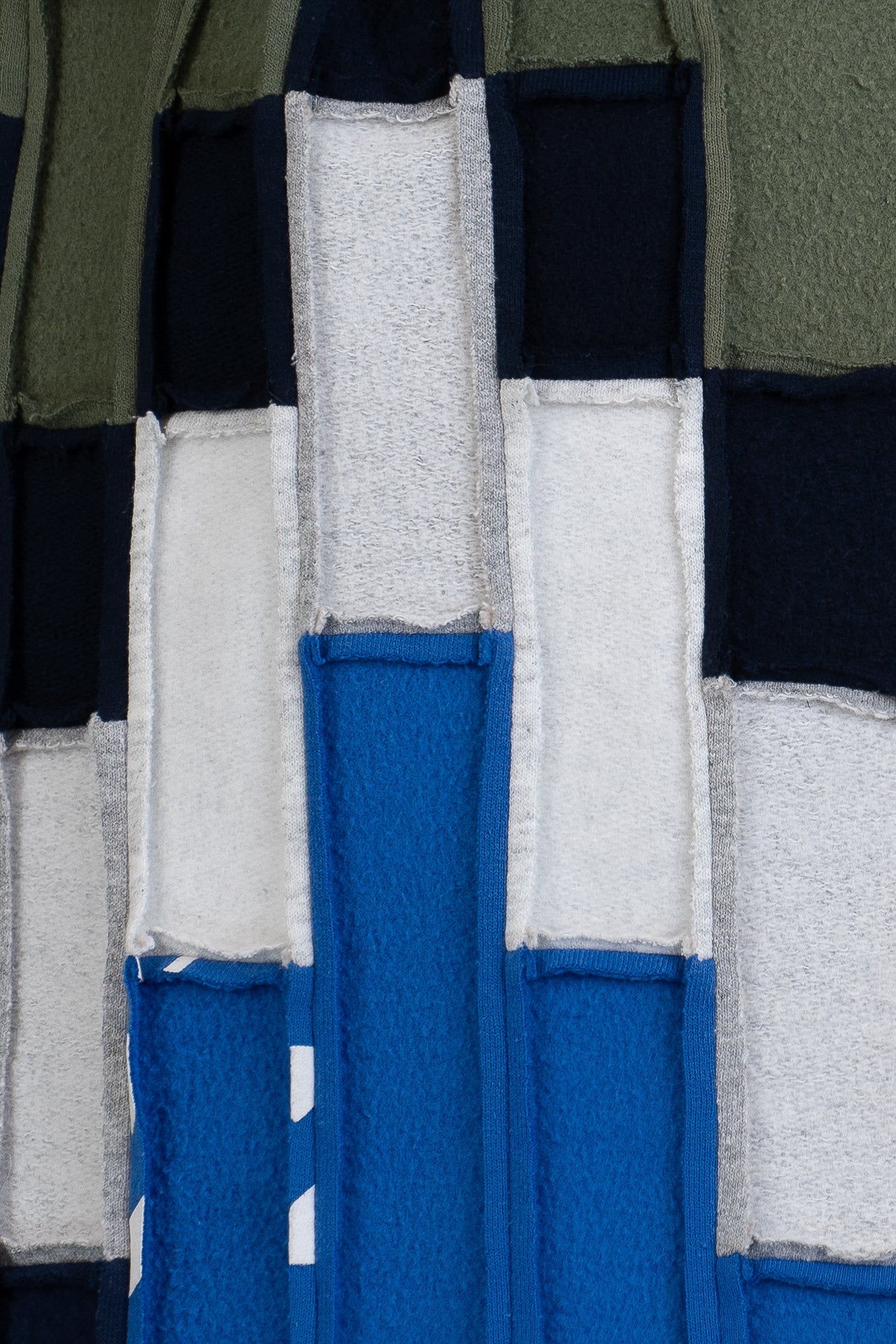 Strips of different lengths are cut from hoodies and carefully rejoined in a pixel-like puzzle remix to make a scarf that is as durable and comforting as your favourite hoodie.