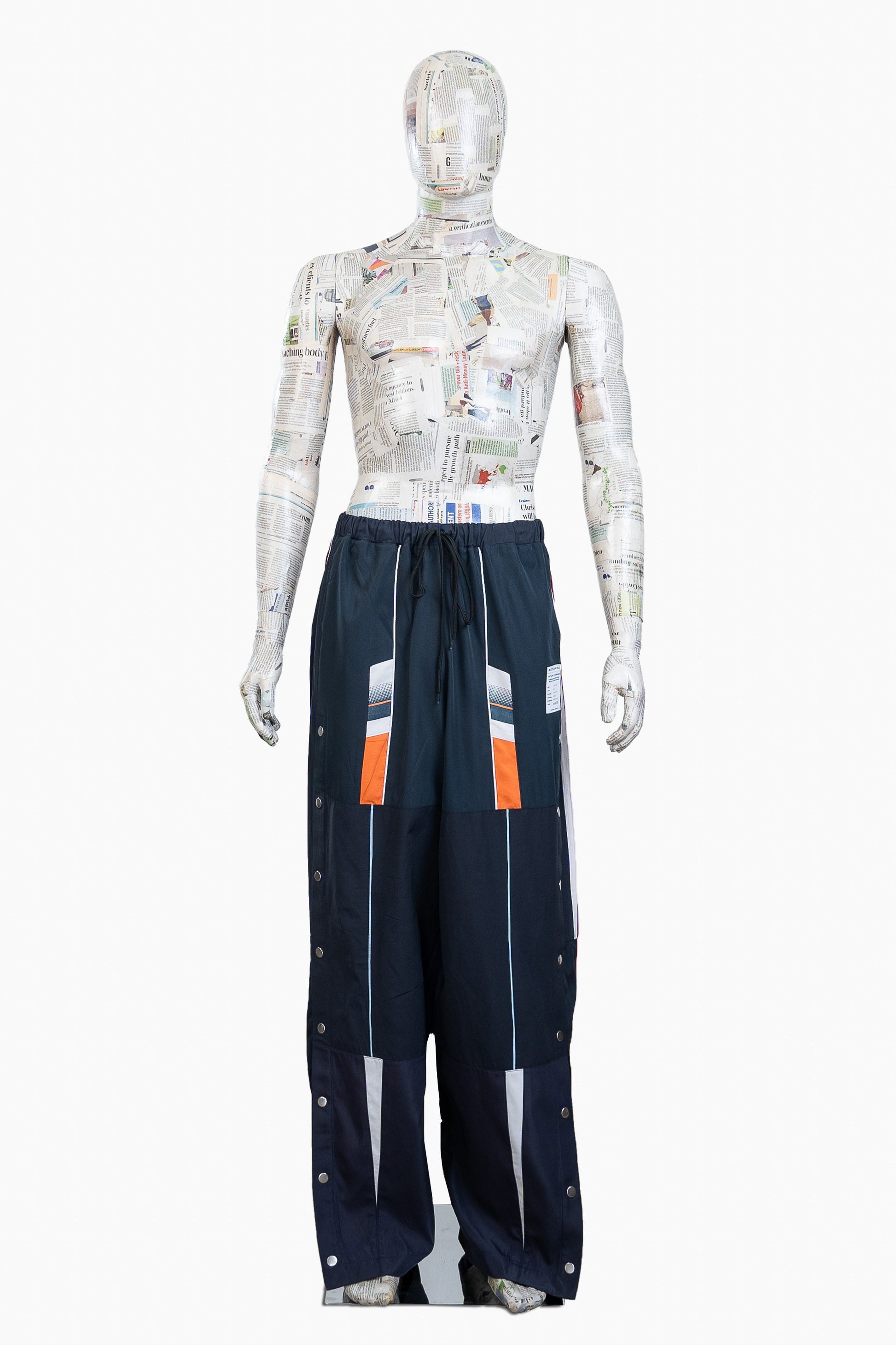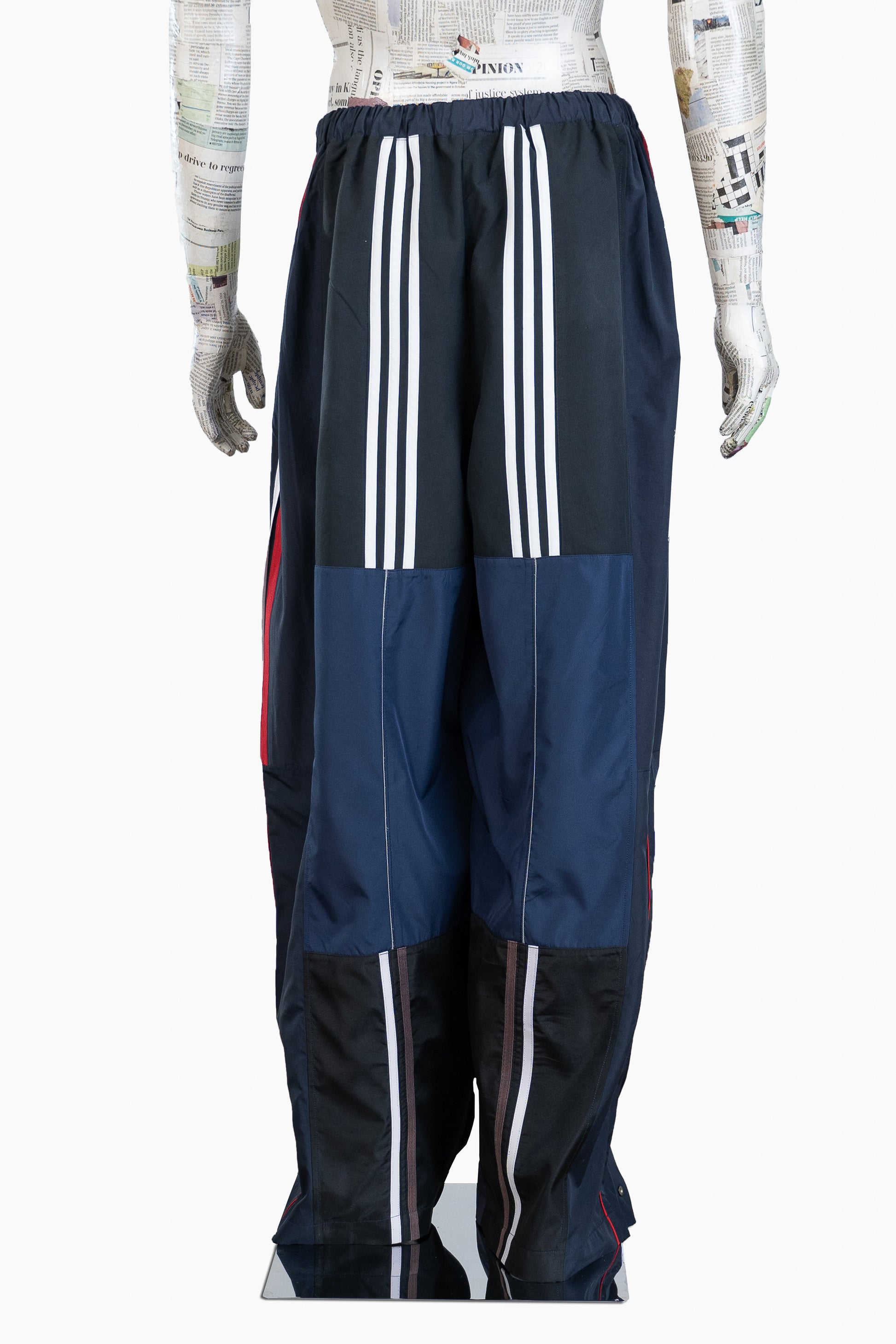 Panels extracted from eight different pairs of track pants are paired and joined to make loose-fitting, elegant pants, featuring snap buttons along the side seams.