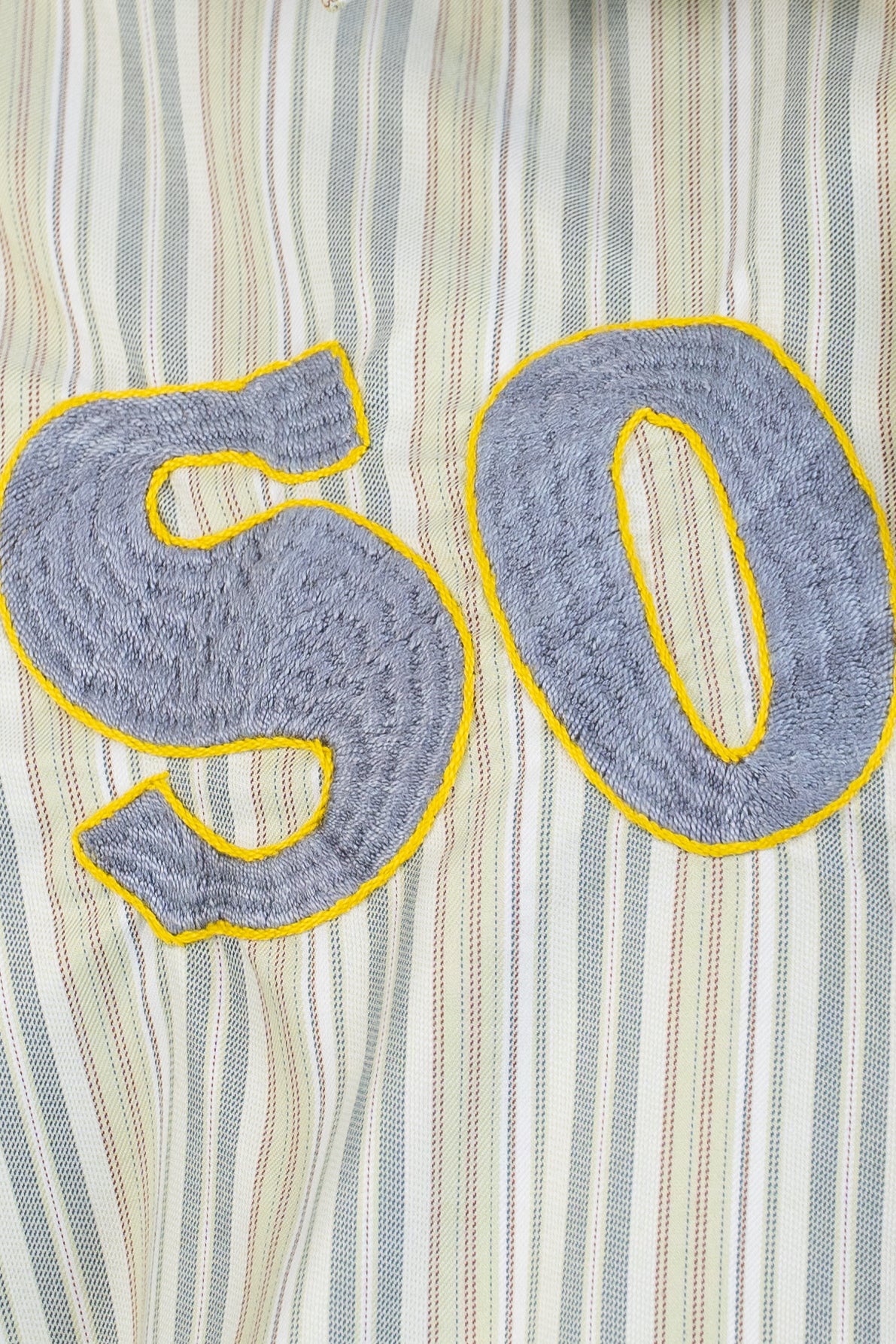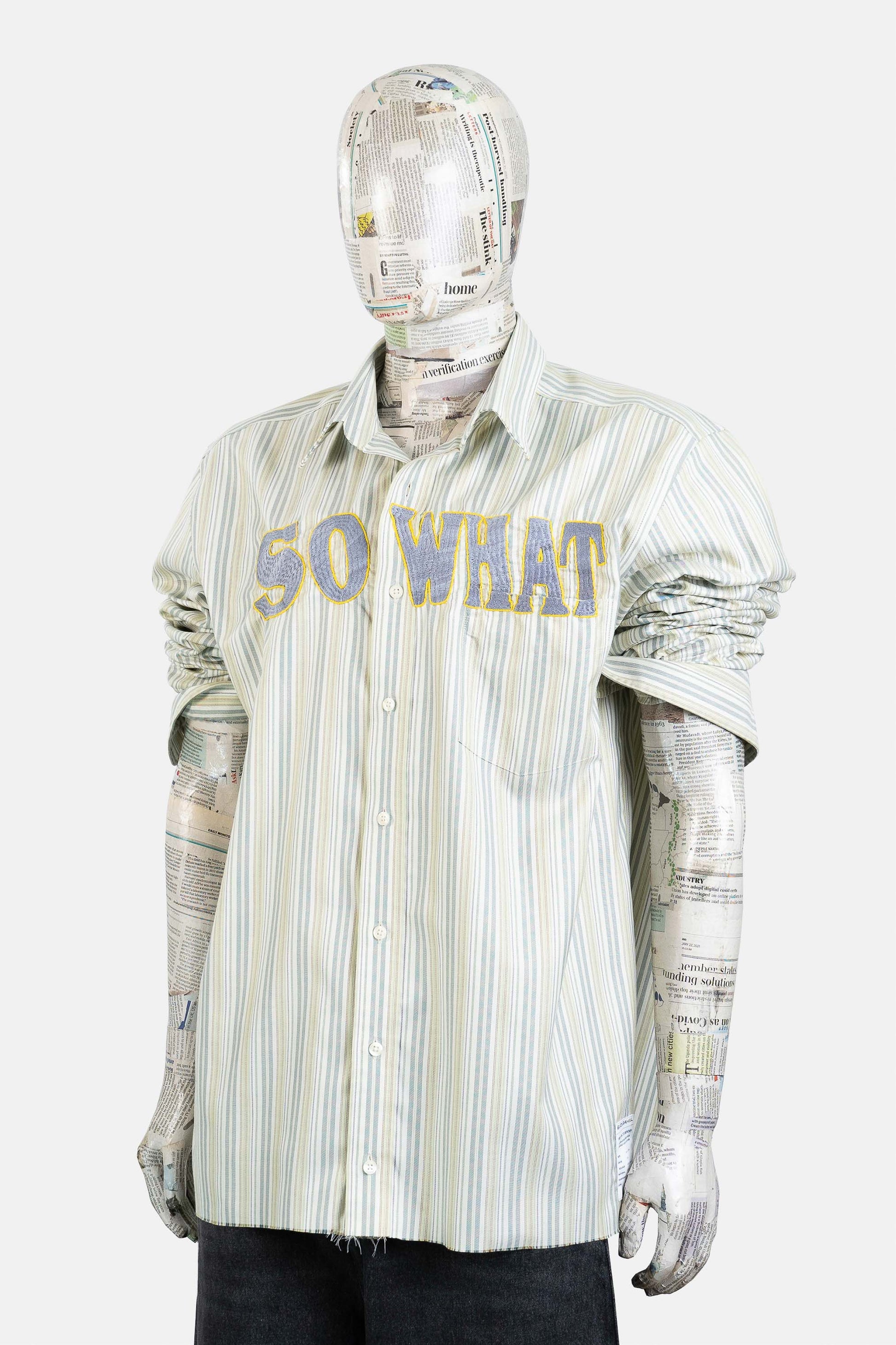 SO WHAT taxi slogan applied onto a shirt by the Milaya Project using traditional South Sudanese embroidery. The raw-cut hem will fray and evolve with time.