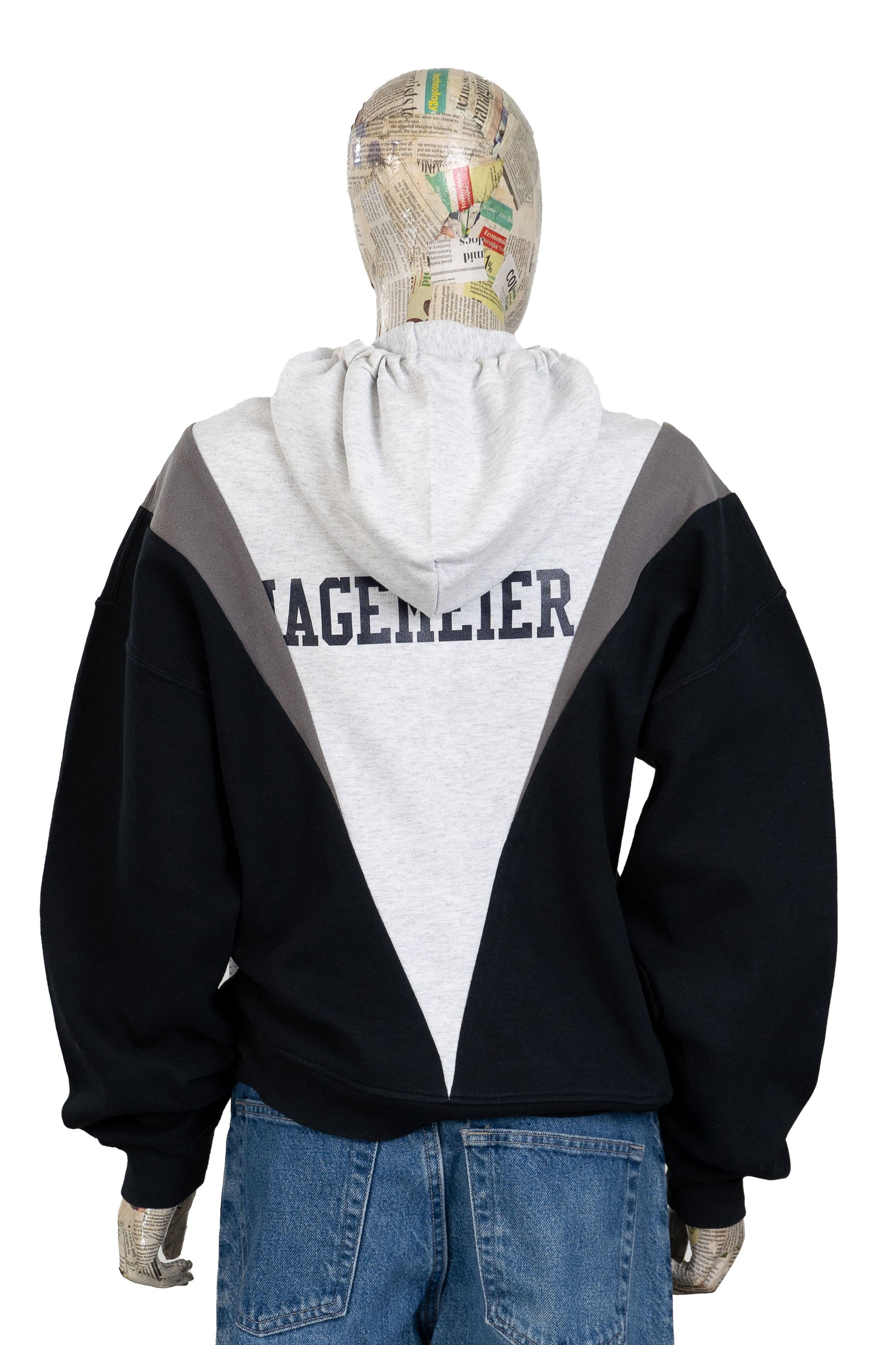 Two hoodies are joined with a triangle insert, dropping the shoulder and creating a roomy, 90s-inspired fit. The contrasting strips are made using sweatshirt offcuts.