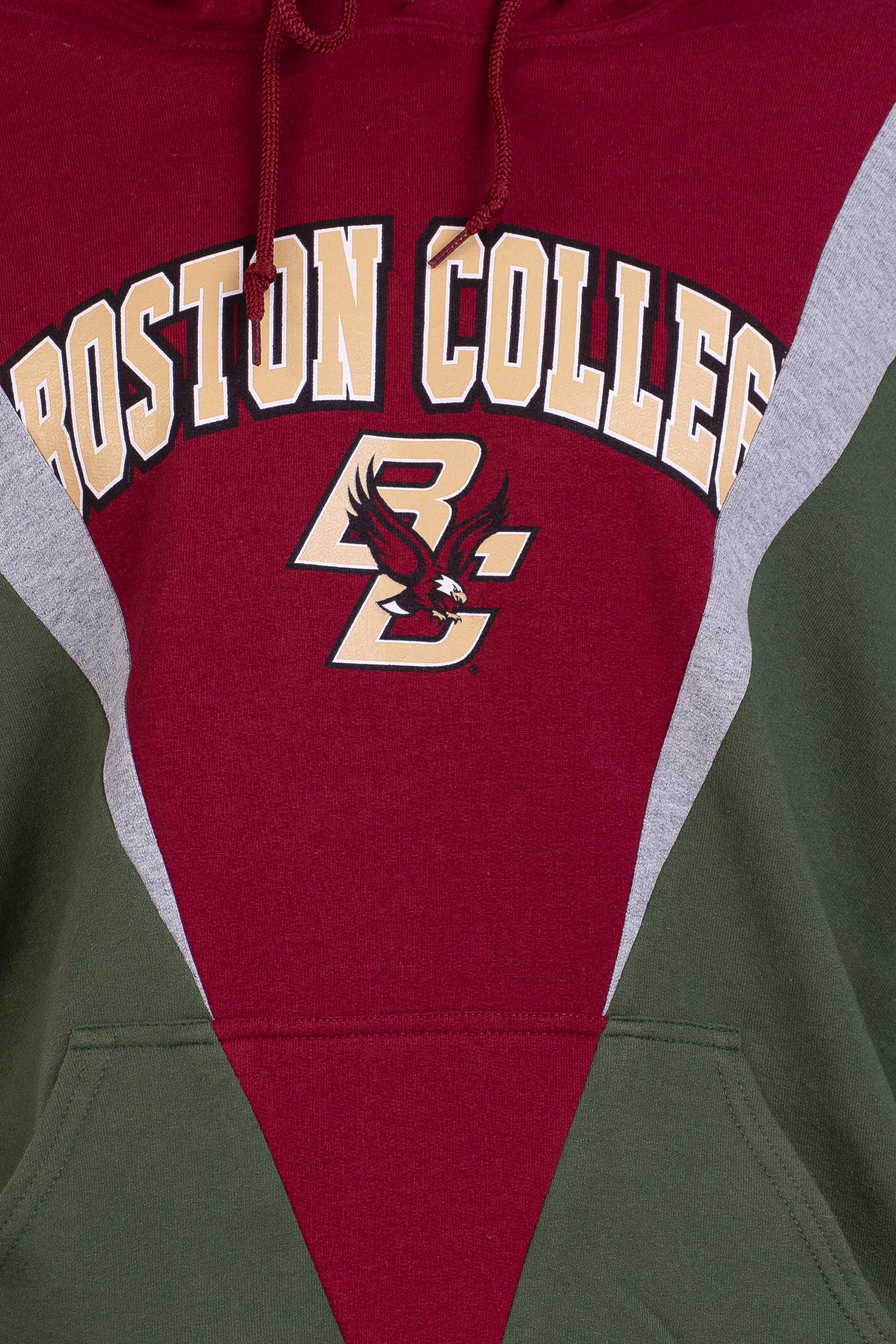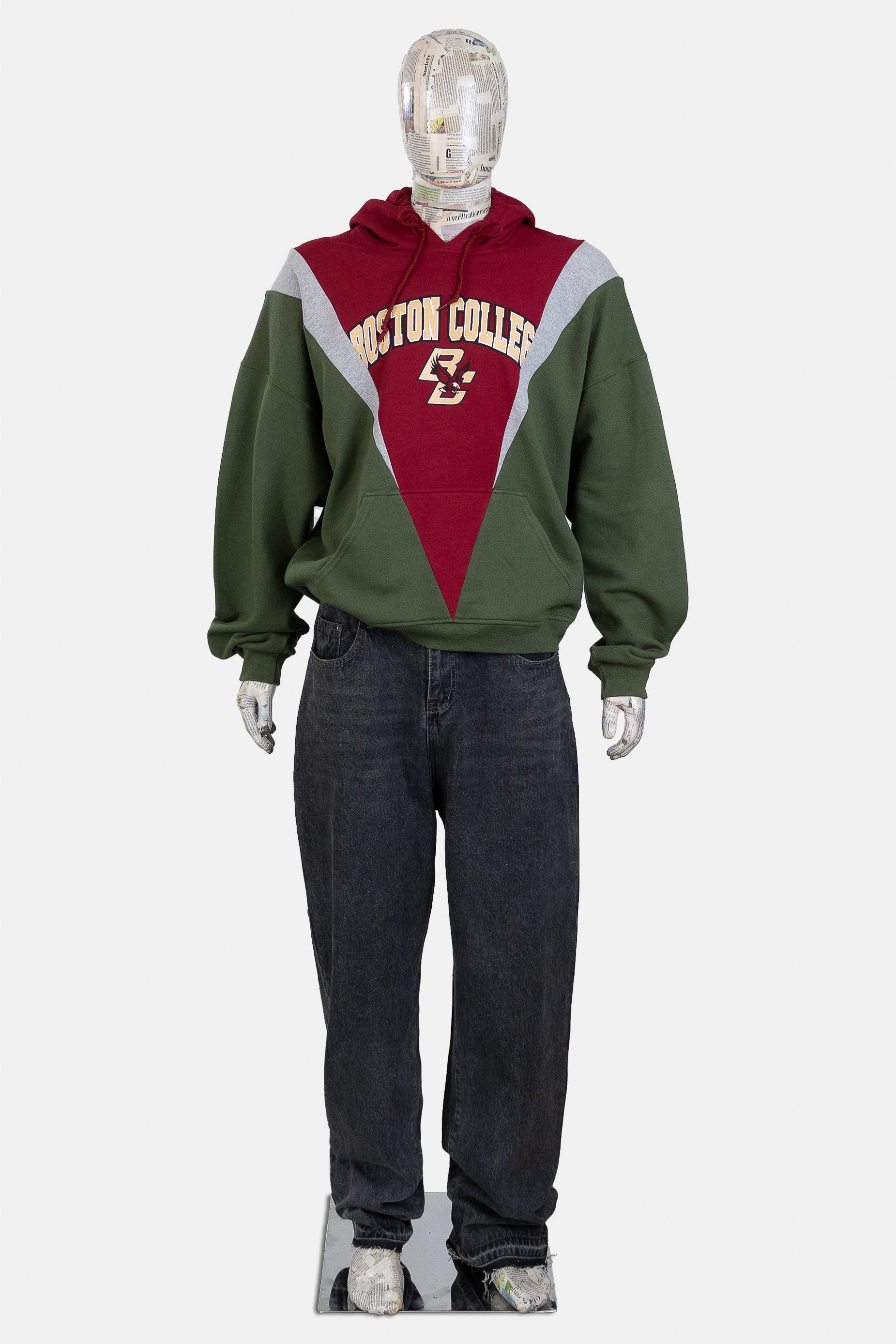 Two hoodies are joined with a triangle insert, dropping the shoulder and creating a roomy, 90s-inspired fit. The contrasting strips are made using sweatshirt offcuts.