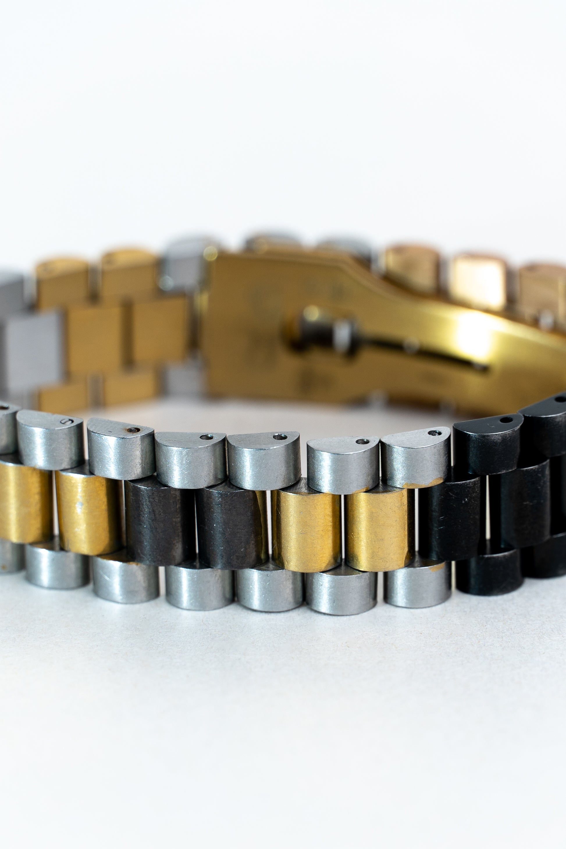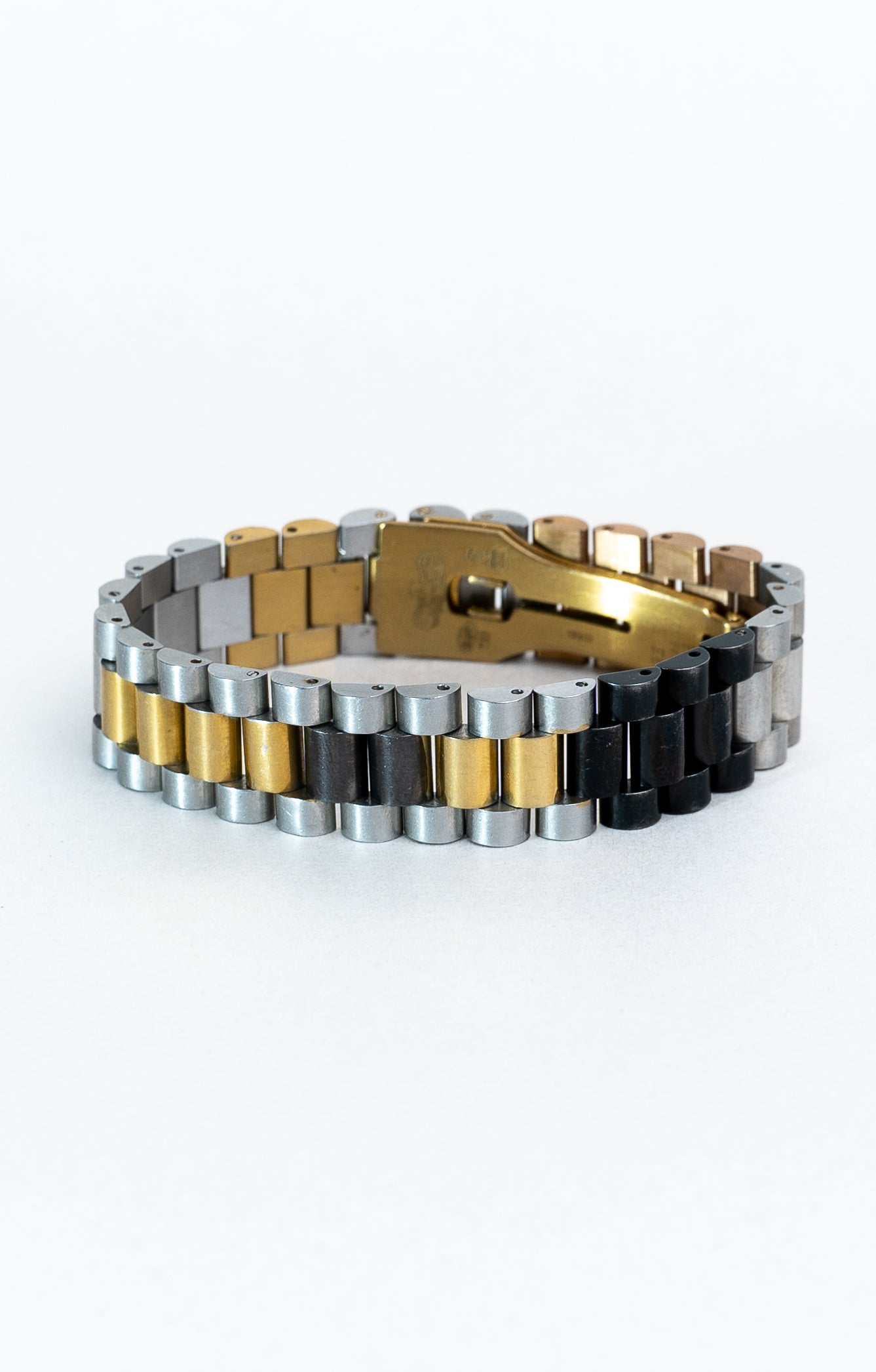 Bracelet made using fragments from watches which are carefully chosen and joined by a watch repairer. Small scratches and patina are a testament to the past lives of each fragment.