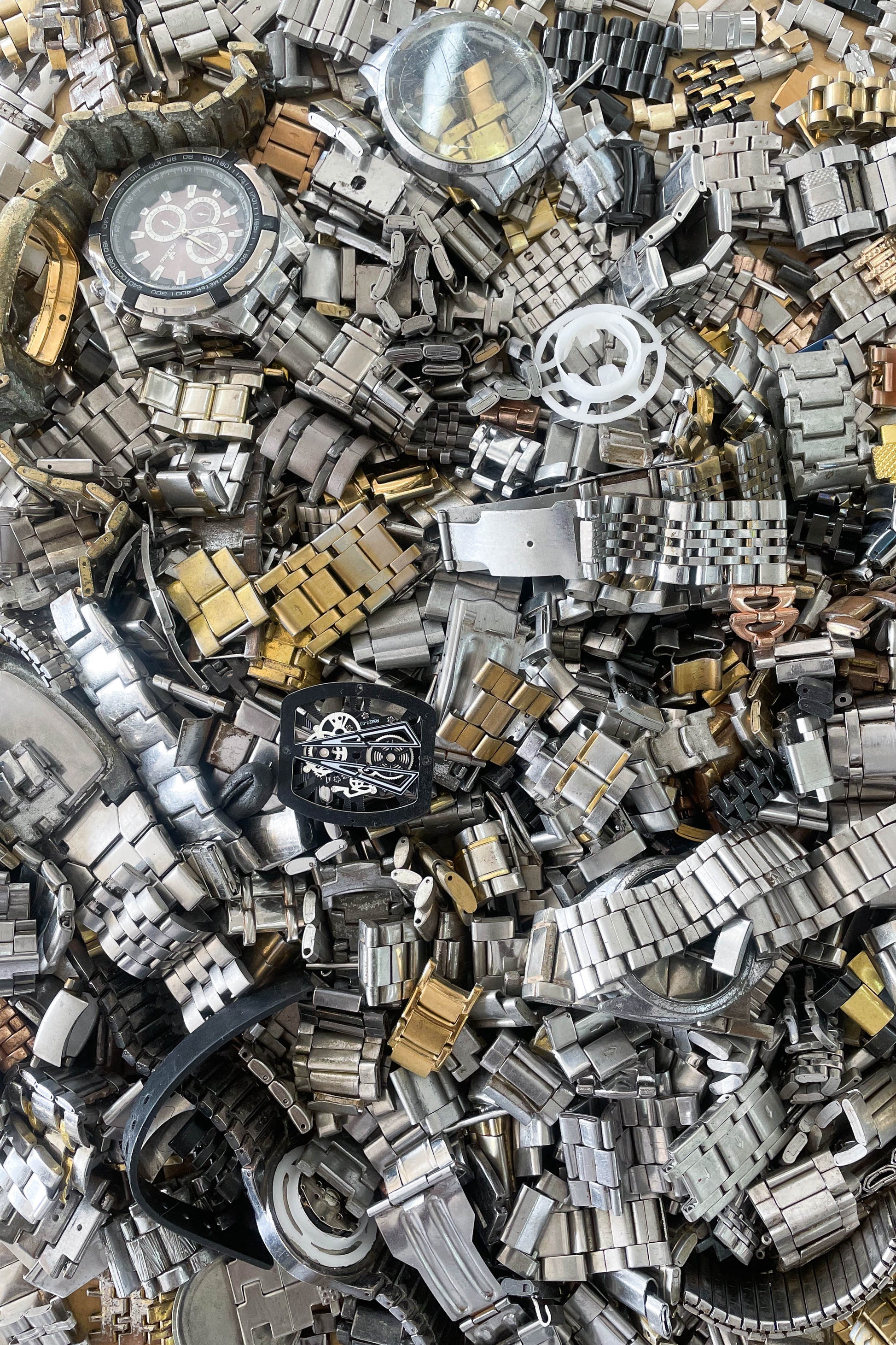 Bracelet made using fragments from watches which are carefully chosen and joined by a watch repairer. Small scratches and patina are a testament to the past lives of each fragment.